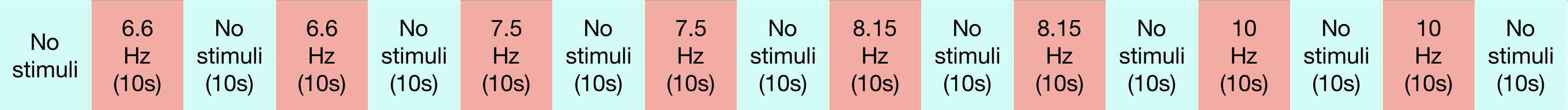 - Each trial uses one of four target frequencies: 6.6 Hz, 7.5 Hz, 8.75 Hz, 10 Hz.