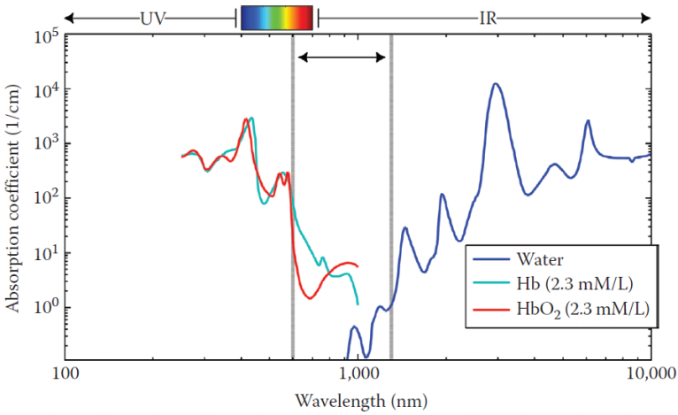 Biological tissues are largely opaque to visible light but become relatively transparent in the near-infrared (NIR) window, roughly 700-900 nm. Two chromophores in this window are biologically relevant for brain monitoring: